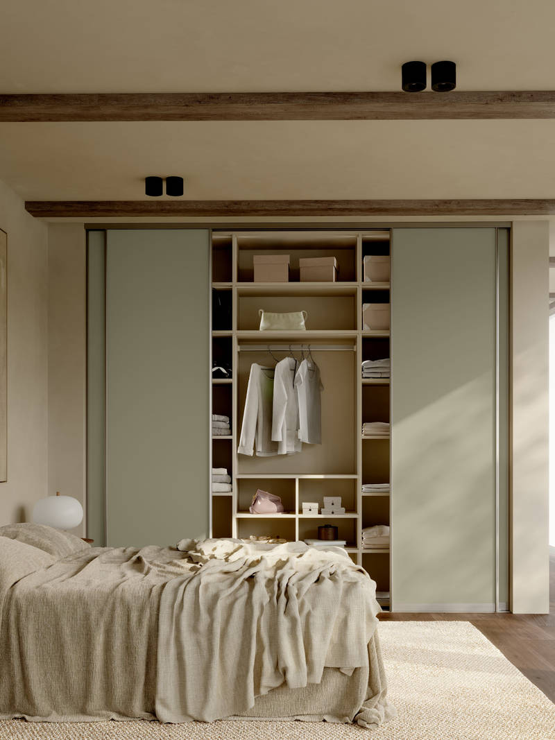 Invitas indretningssystem til walk-in closets er i et stilrent og enkelt design. Det kan kombineres med den skydedørstype du ønsker. Inventaret virker let og eksklusivt og har et minimalistisk look.