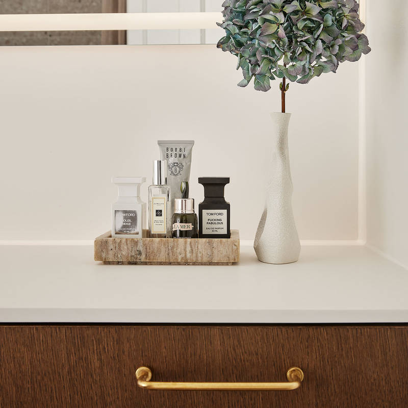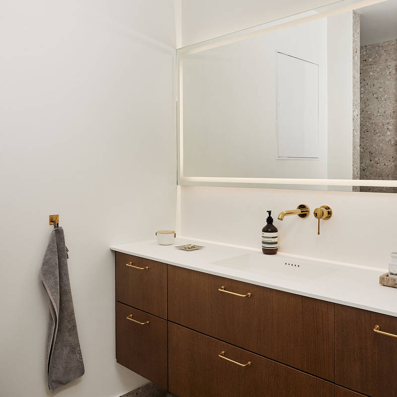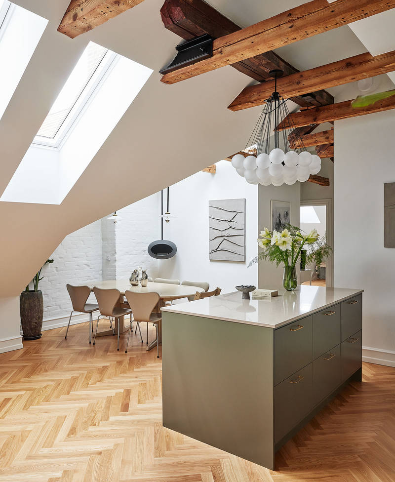 Køkkenet og badeværelset er fra INVITA og var installeret i lejligheden ved indflytning. Den grønne farve og det mørke træ på overskabene matcher de mørke træbjælker, som er med til at give lejligheden charme og kant. Athena-køkkenet kan designes på mange måder, og her er valgt en løsning med messingdetaljer på både armatur og greb, som skaber en følelse af luksus. Messing er et holdbart materiale, der forener klassisk og moderne stil.