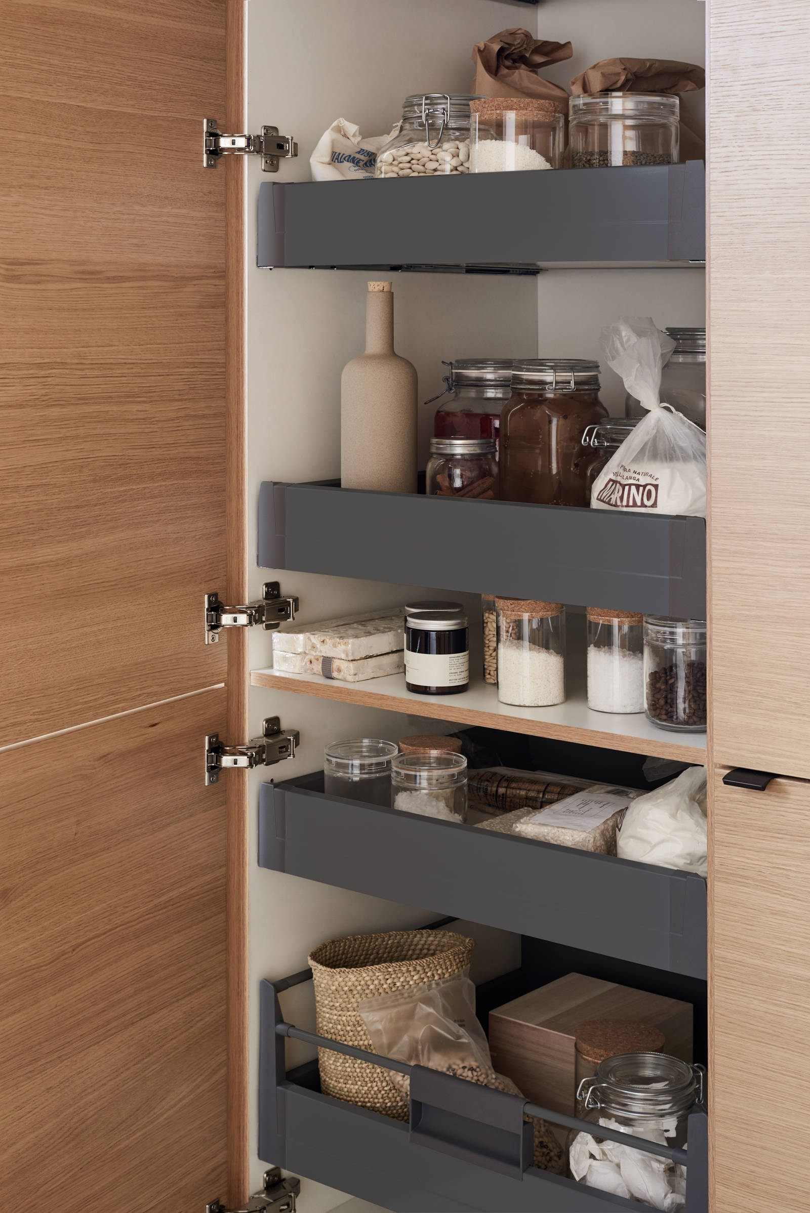 Måske er der ikke plads til et decideret viktualierum i boligen. INVITA har også en række forskellige løsninger med viktualieskabe, som giver masser af praktisk og let overskuelig opbevaring. Eksempelvis kan et stort hjørneskab indrettes som viktualieskab, hvor der er plads til f.eks. kartofler og andre grove grøntsager i bunden, mens hylder i forskellig bredde og dybde giver plads til f.eks. konserves og toiletpapir.