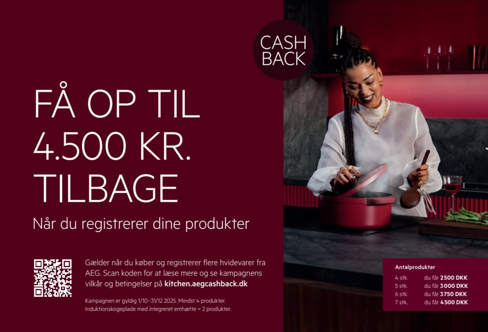 Fra d. 1/10 – 31/12 2025giver vi dig penge tilbage, når du køber udvalgte produkter fra AEG. Kampagnen gælder når du køber og registrerer flere hvidevarer fra AEG. Læs mere og se kampagnen vilkår og betingelser på kitchen.aegcashback.dk.