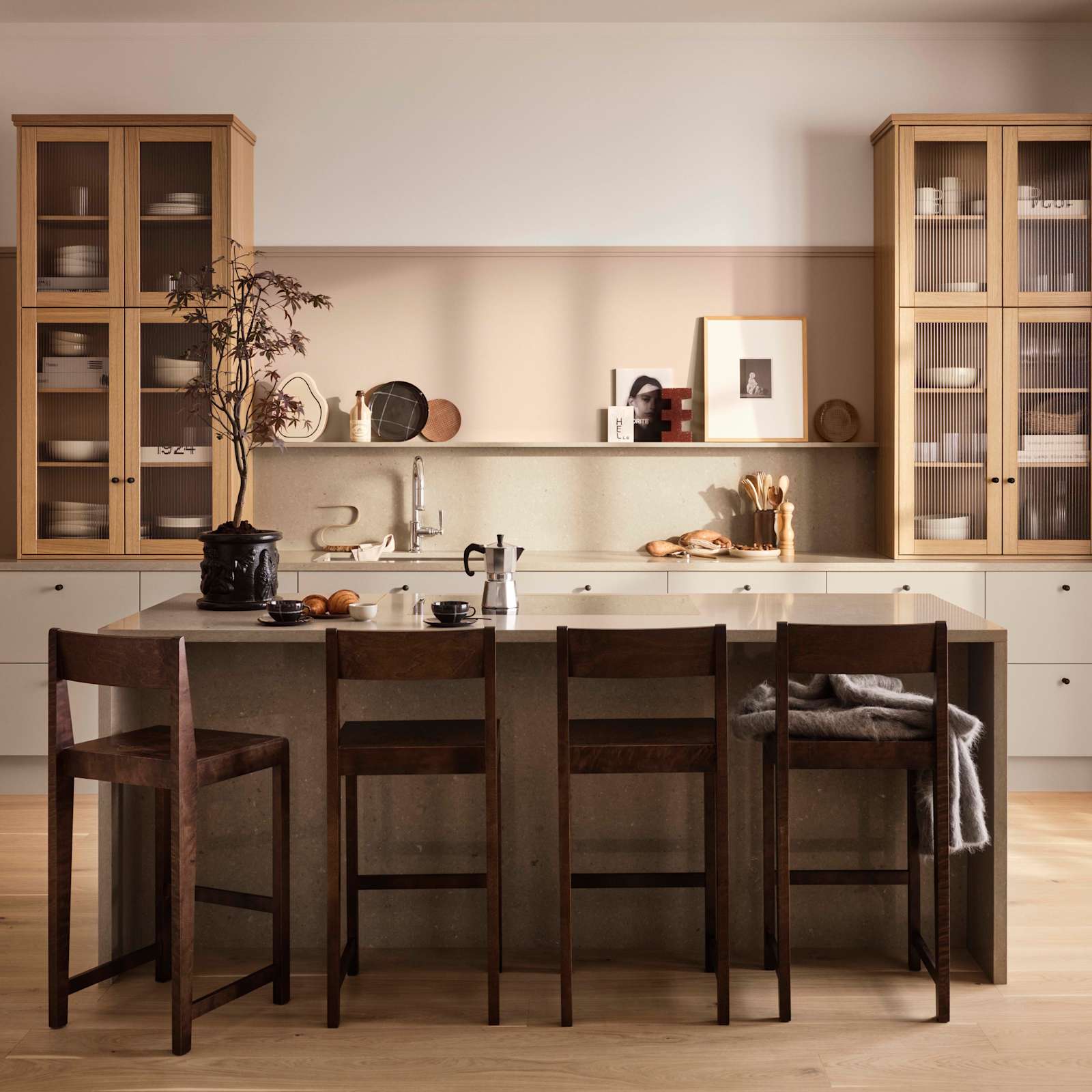 I modsætning til lukkede skabe virker et vitrineskab mere luftigt og let, hvilket er ideelt i mindre eller mørkere køkkener. Vi tilbyder også indbygget lys i vitrineskabene, som giver skabet et mere luksuriøst look.